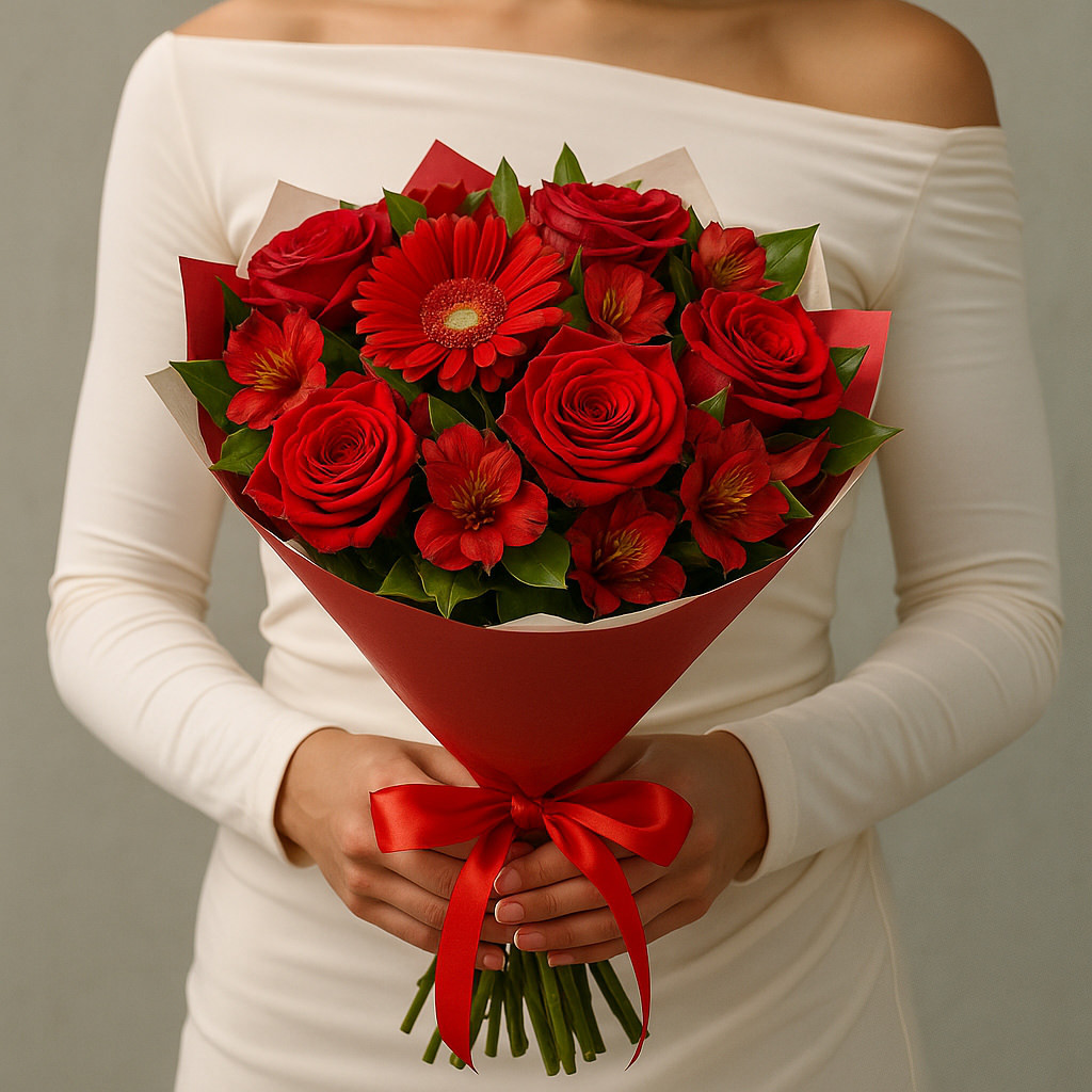 Яркий букет из красных роз и гербер — воплощение страсти, красоты и искренних эмоций. Роскошные цветы в насыщенных тонах подчеркнут значимость момента и помогут выразить самые тёплые чувства.