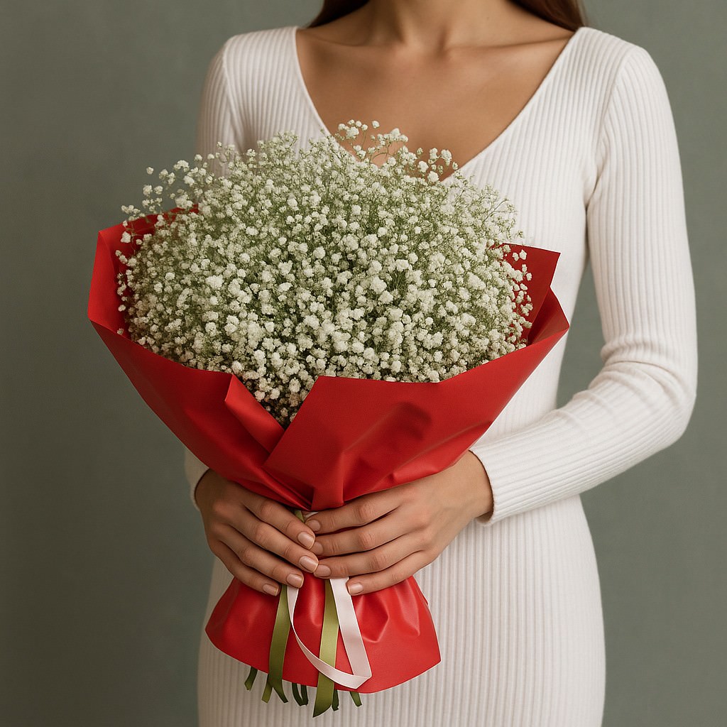 Лёгкий и воздушный букет из гипсофилы в красной упаковке напоминает пушистое облако. Он подчеркнёт нежность и чистоту чувств, станет стильным подарком для любого торжества и порадует своей элегантностью.