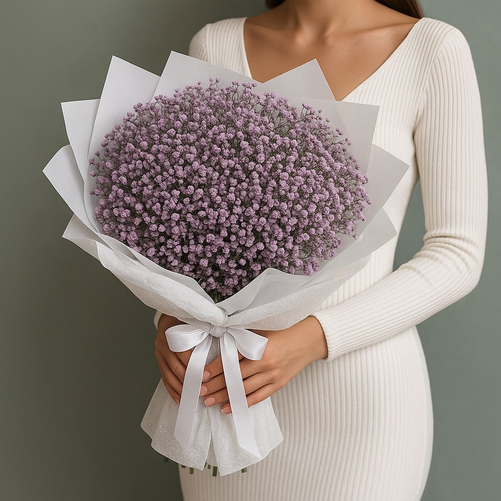 Воздушный и нежный букет из гипсофилы в мягких сиреневых оттенках. Он словно окутывает теплом и уютом, напоминая о летних закатах и лёгком аромате полевых цветов. Идеален как романтический подарок, а также как символ заботы и искренности.