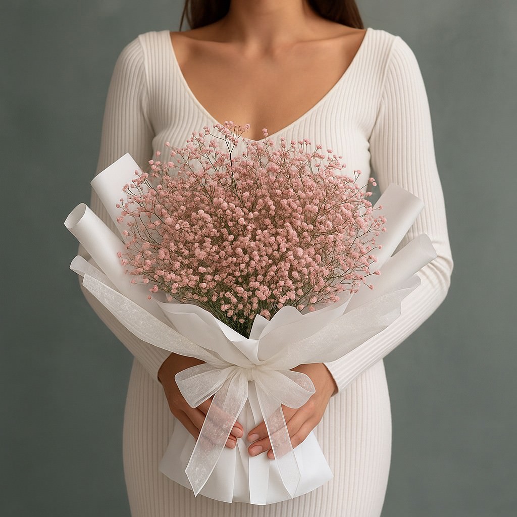 Воздушный и романтичный букет из нежно-розовой гипсофилы в стильной белой упаковке — символ лёгкости и трогательной красоты. Он наполнен чувством нежности и станет идеальным подарком для самых дорогих и близких людей.