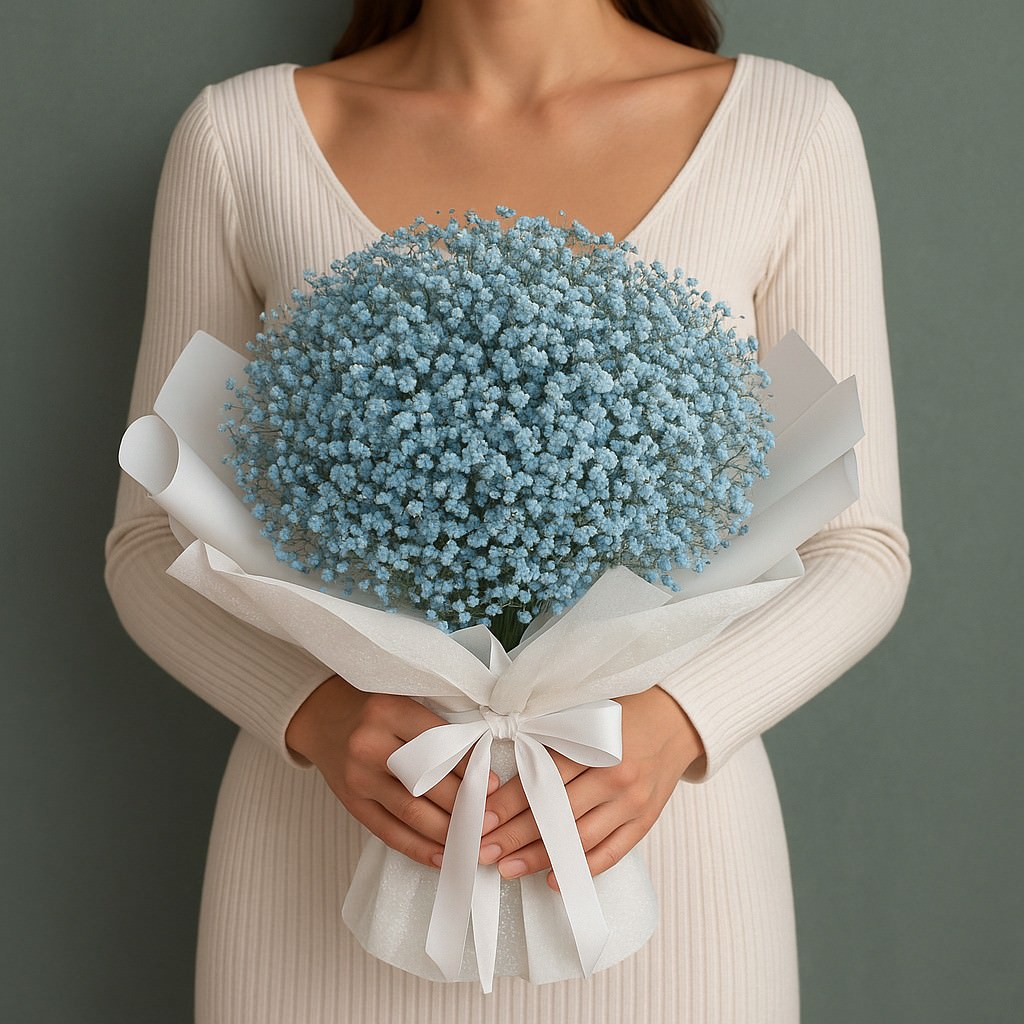 Воздушный и трогательный букет из голубой гипсофилы символизирует чистоту, лёгкость и романтику. Такой подарок подарит ощущение нежности и станет изысканным акцентом для особого случая.