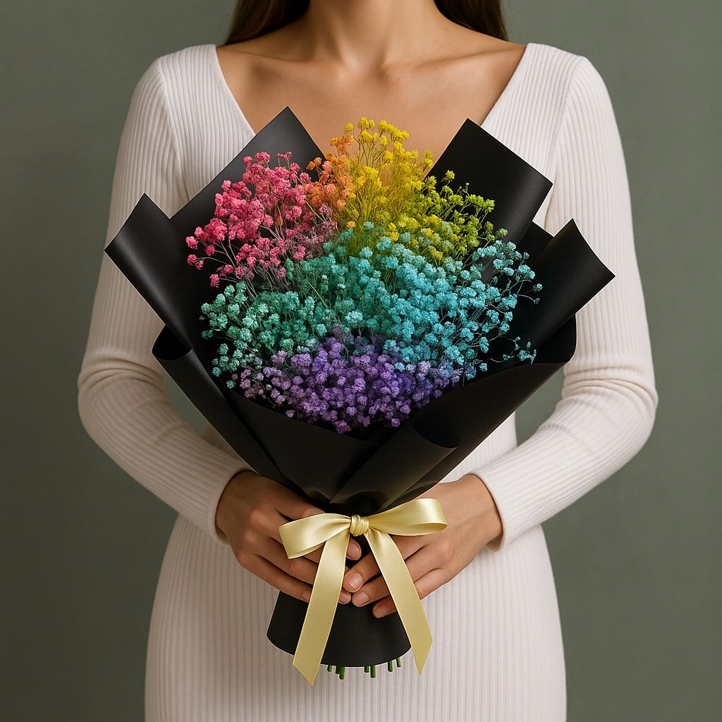 Яркий и оригинальный букет из разноцветной гипсофилы в стильной черной упаковке — смелый акцент, который не оставит равнодушным. Его насыщенные оттенки создают атмосферу радости и свободы, а воздушные соцветия придают композиции лёгкость и романтичность. Такой букет идеально подойдёт для тех, кто любит необычные решения и хочет удивить.