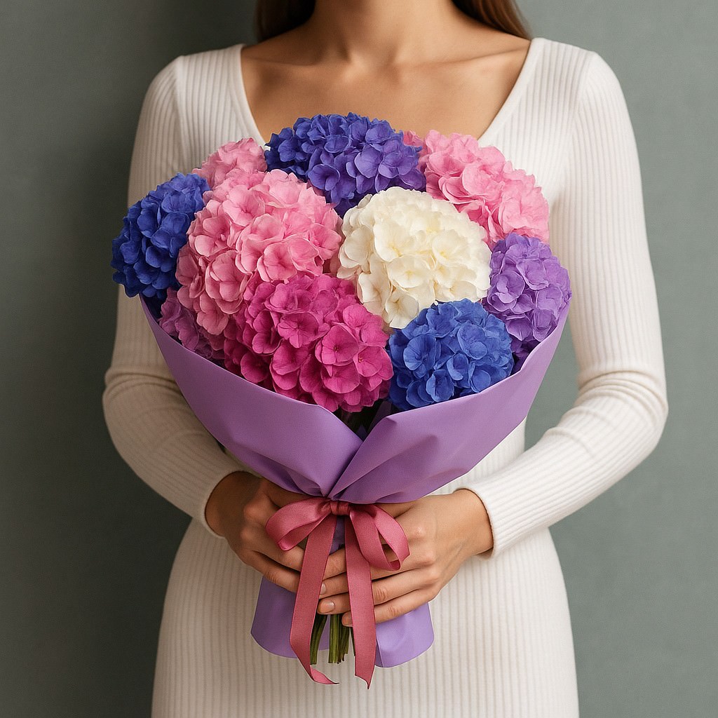 Воздушный букет из одиннадцати пышных гортензий в мягкой пастельной гамме.