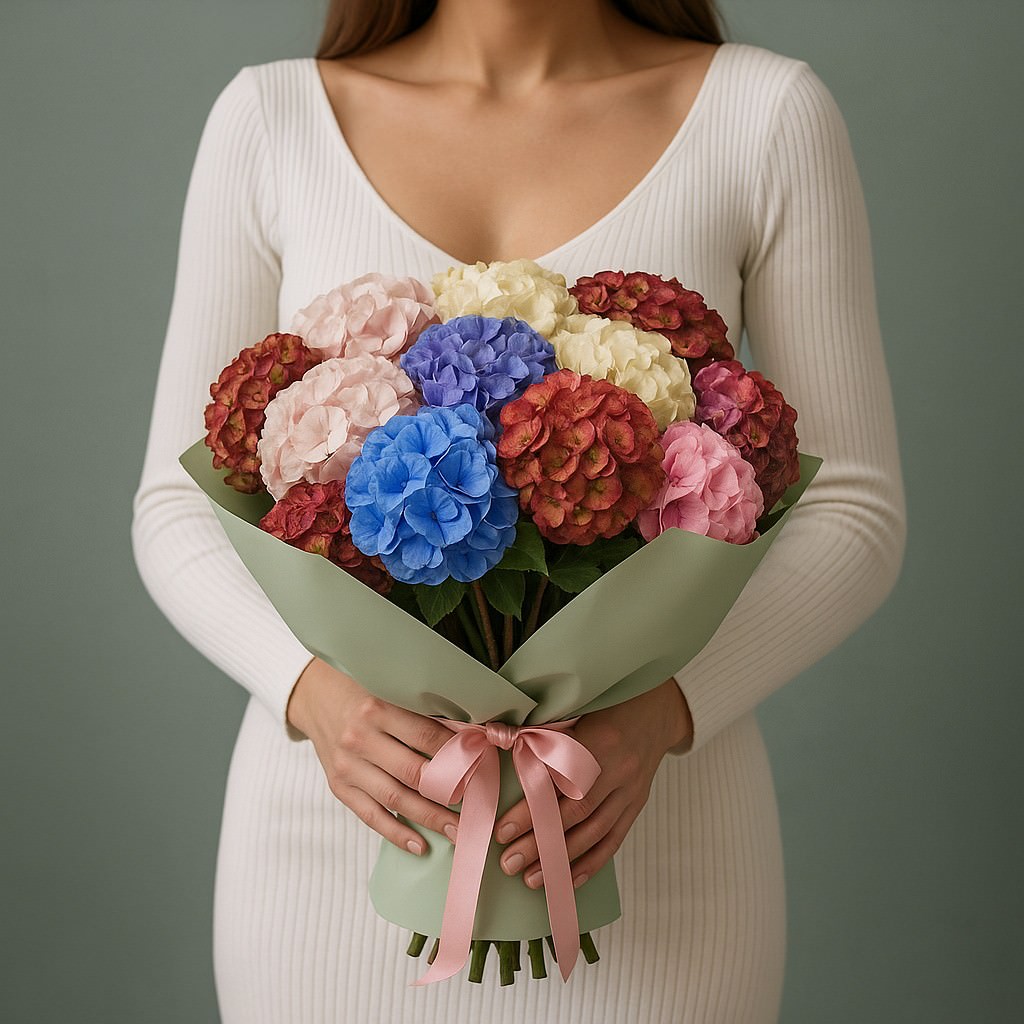 Букет «Яркая гармония» — это насыщенная палитра летних красок, собранная в утончённой форме. Контраст нежных пастельных и глубоких насыщенных оттенков гортензий создаёт праздничное настроение и делает композицию выразительной и элегантной. Такой букет станет идеальным подарком для ярких и энергичных людей, подчеркнёт искренность чувств и создаст атмосферу праздника.