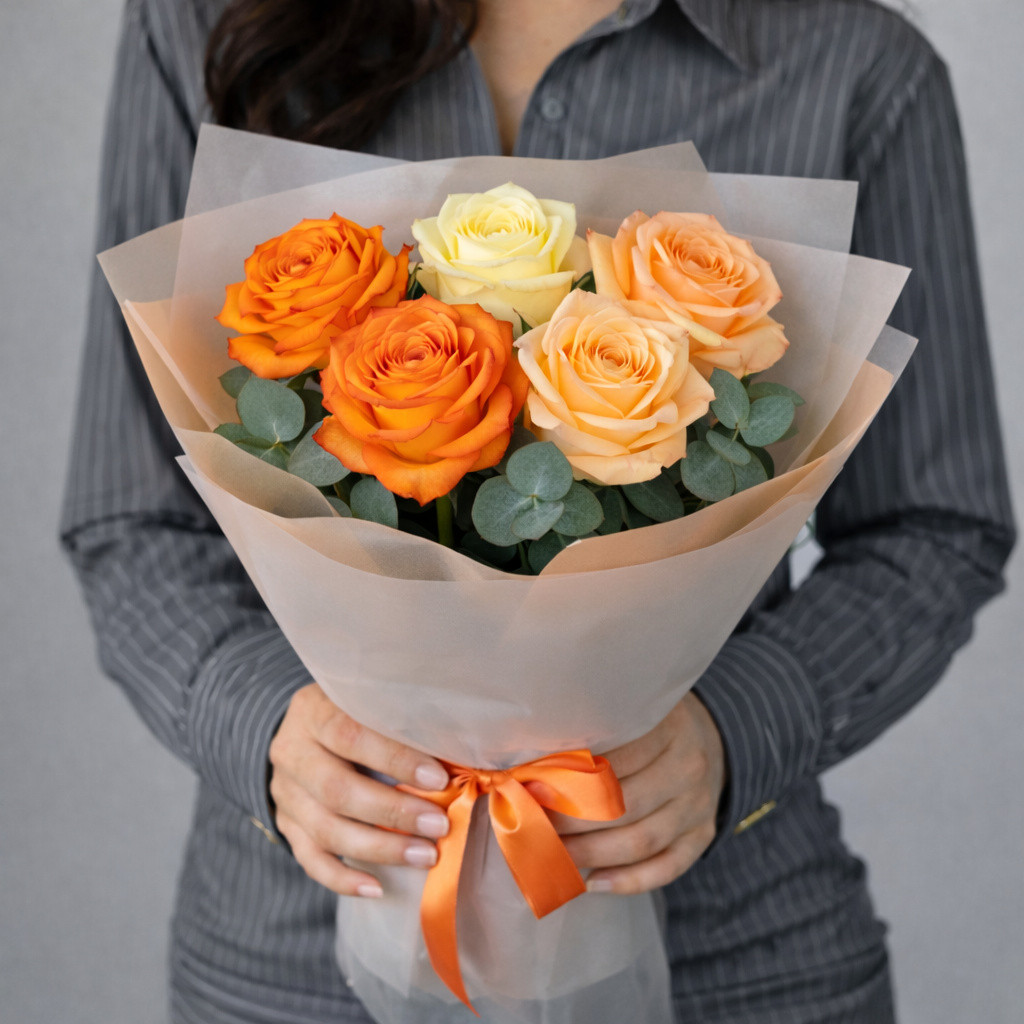Изысканный букет из пяти оранжевых роз — это символ энергии, тепла и искренних эмоций. Яркие, словно согретые солнцем лепестки, создают атмосферу радости и вдохновения, наполняя пространство светом и уютом. Такой букет станет прекрасным подарком для выражения благодарности, поддержки, восхищения или просто для того, чтобы подарить хорошее настроение без повода.