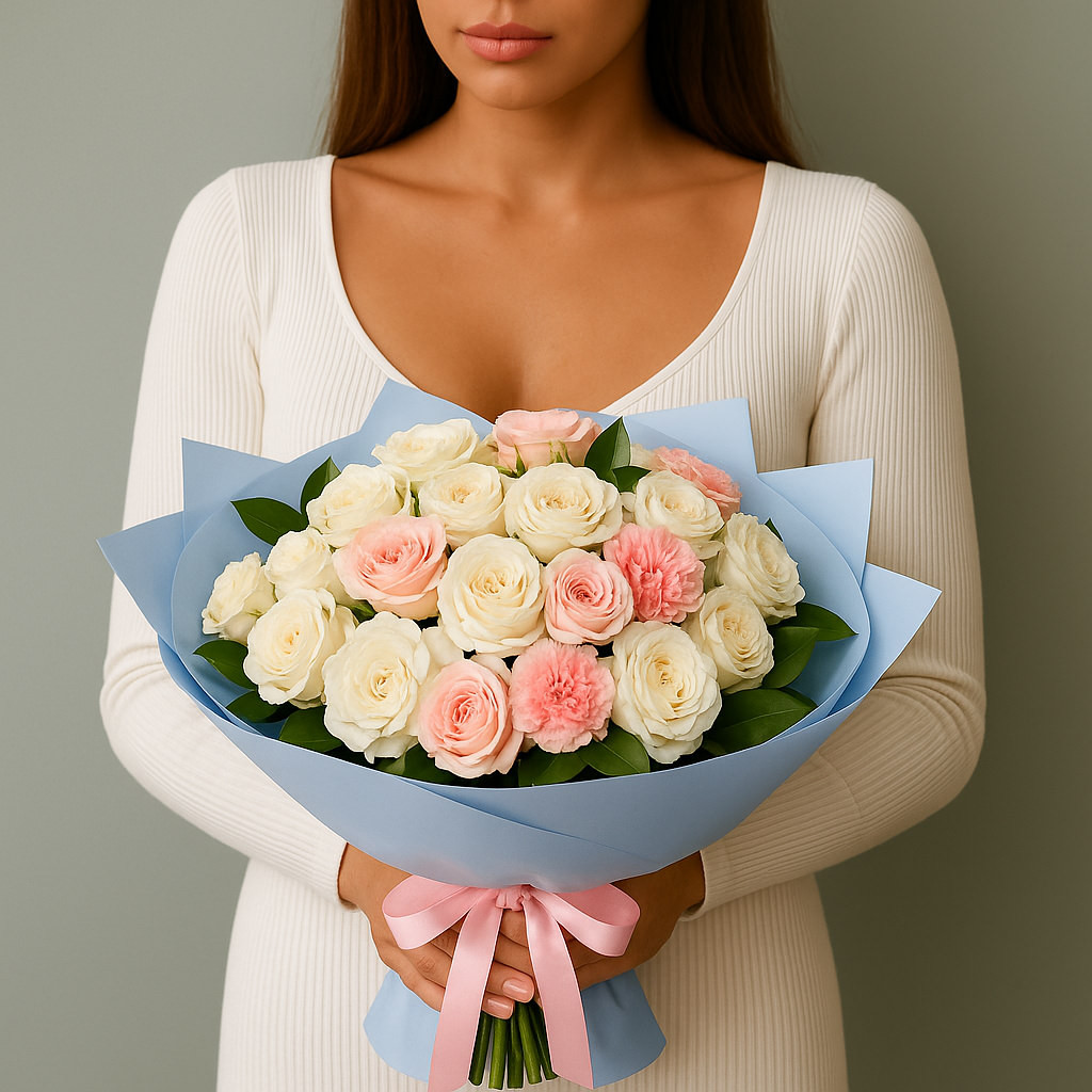 Элегантная композиция в нежной пастельной гамме, наполненная свежестью и лёгкостью. Сочетание нежных роз и розовых карнаций создаёт гармоничный ансамбль, который подчеркнёт изысканность любого момента. Такой букет станет прекрасным подарком для выражения искренних чувств, поздравления или романтического жеста.