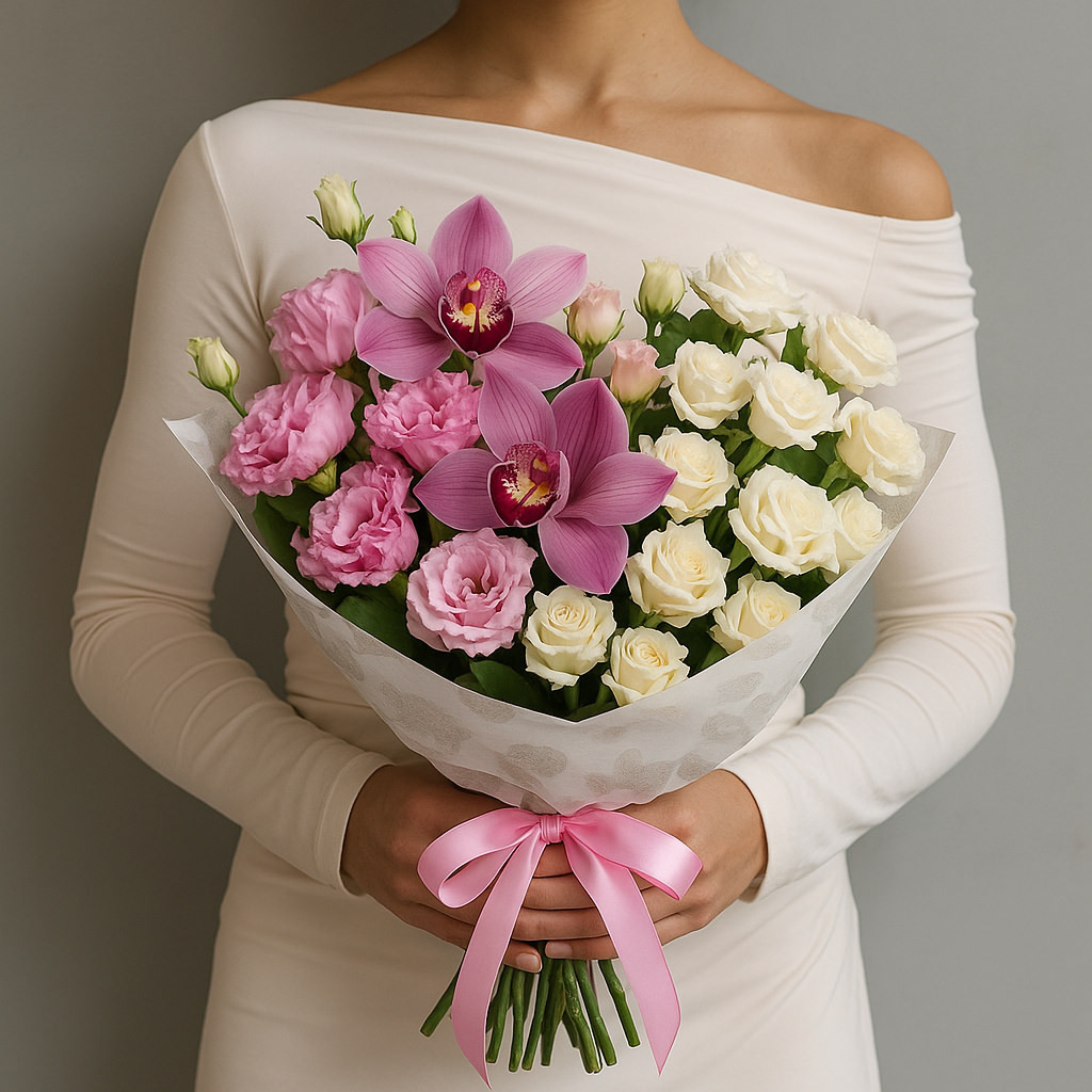 Элегантный букет в розово-белой гамме очаровывает своей воздушностью и гармонией. Нежные орхидеи, розы и эустома создают утончённую композицию, которая подчеркнёт важность момента и станет изысканным подарком.