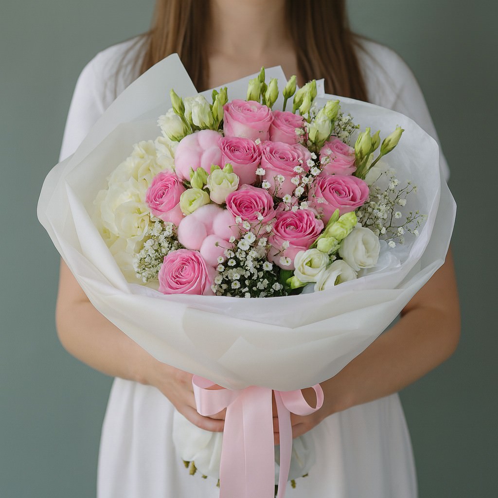 Лёгкий и воздушный букет в розово-белых тонах с изысканными розами и пышной гортензией. Идеален для подарка, чтобы подчеркнуть чистоту чувств и наполнить день теплом и радостью.