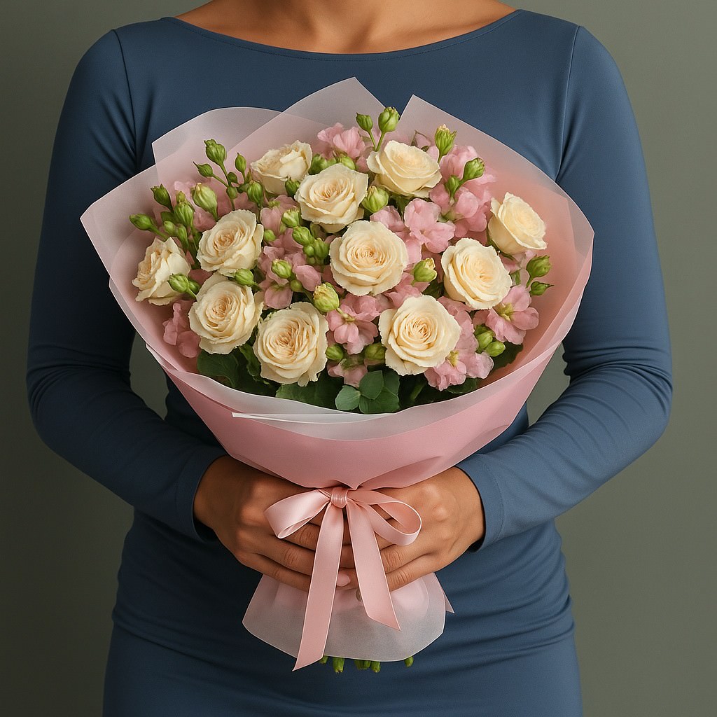 Очаровательный букет из кремовых и нежно-розовых кустовых роз с лёгкими зелёными акцентами — символ утончённости, нежности и искренней заботы. Эта гармоничная композиция идеально подойдёт для дня рождения, романтического свидания или в качестве изысканного подарка без повода. Живые оттенки и воздушное оформление подчеркнут ваши чувства и оставят яркое впечатление.