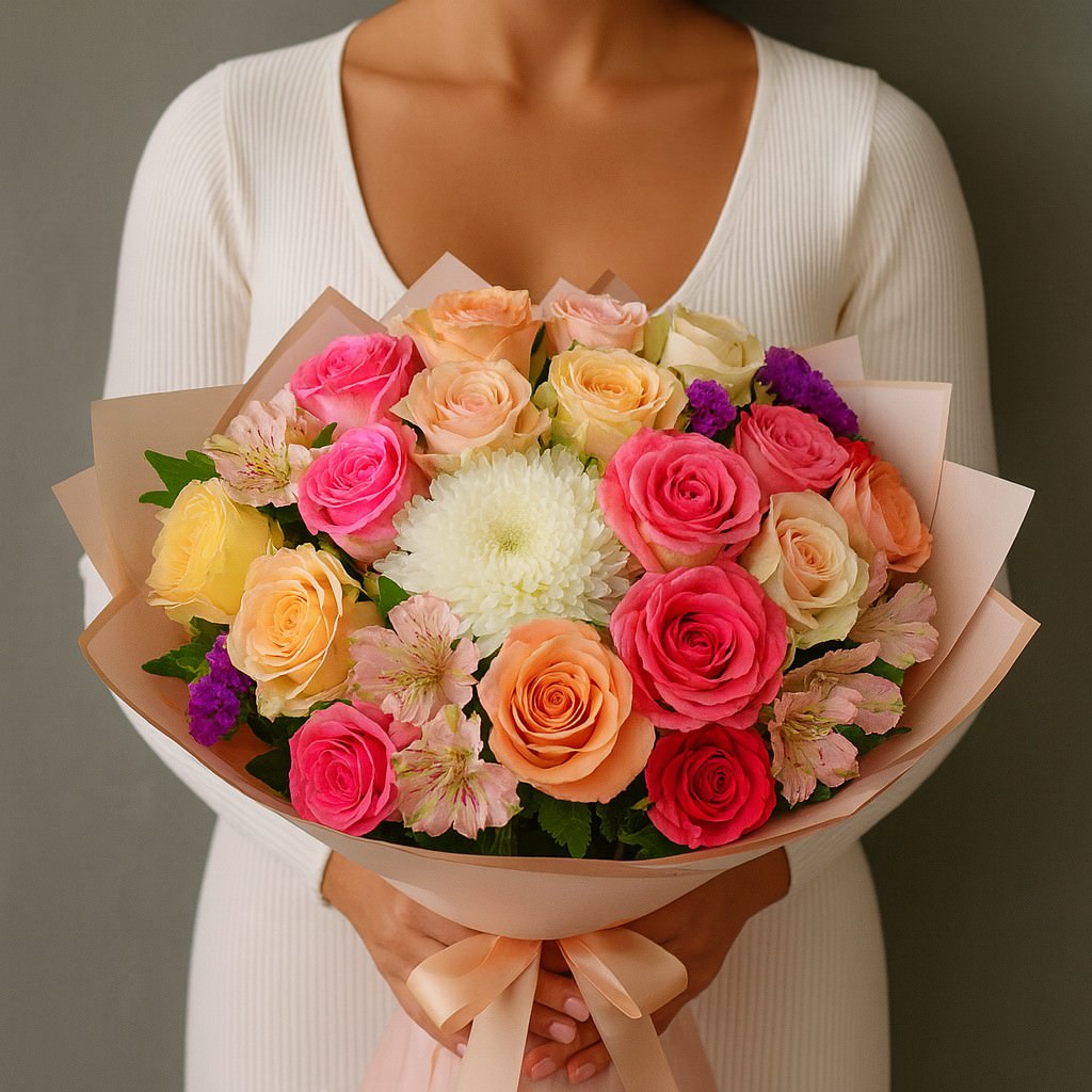 Роскошный букет в нежных пастельных оттенках — символ лёгкости, тепла и радости. Нежно-розовые и кремовые розы, дополненные изящной альстромерией, создают гармоничное сочетание утончённой элегантности и свежести. Такой букет станет прекрасным подарком для выражения самых искренних чувств.