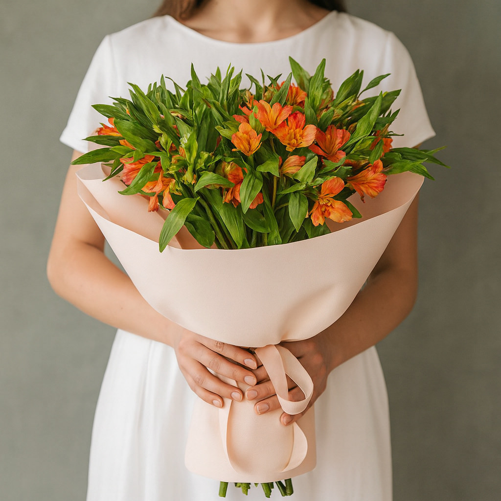Яркий и солнечный букет из оранжевых альстромерий — воплощение радости и энергии. Насыщенные оттенки и лёгкая текстура лепестков создают ощущение живого движения. Элегантная персиковая упаковка и атласная лента подчёркивают природную красоту композиции.
