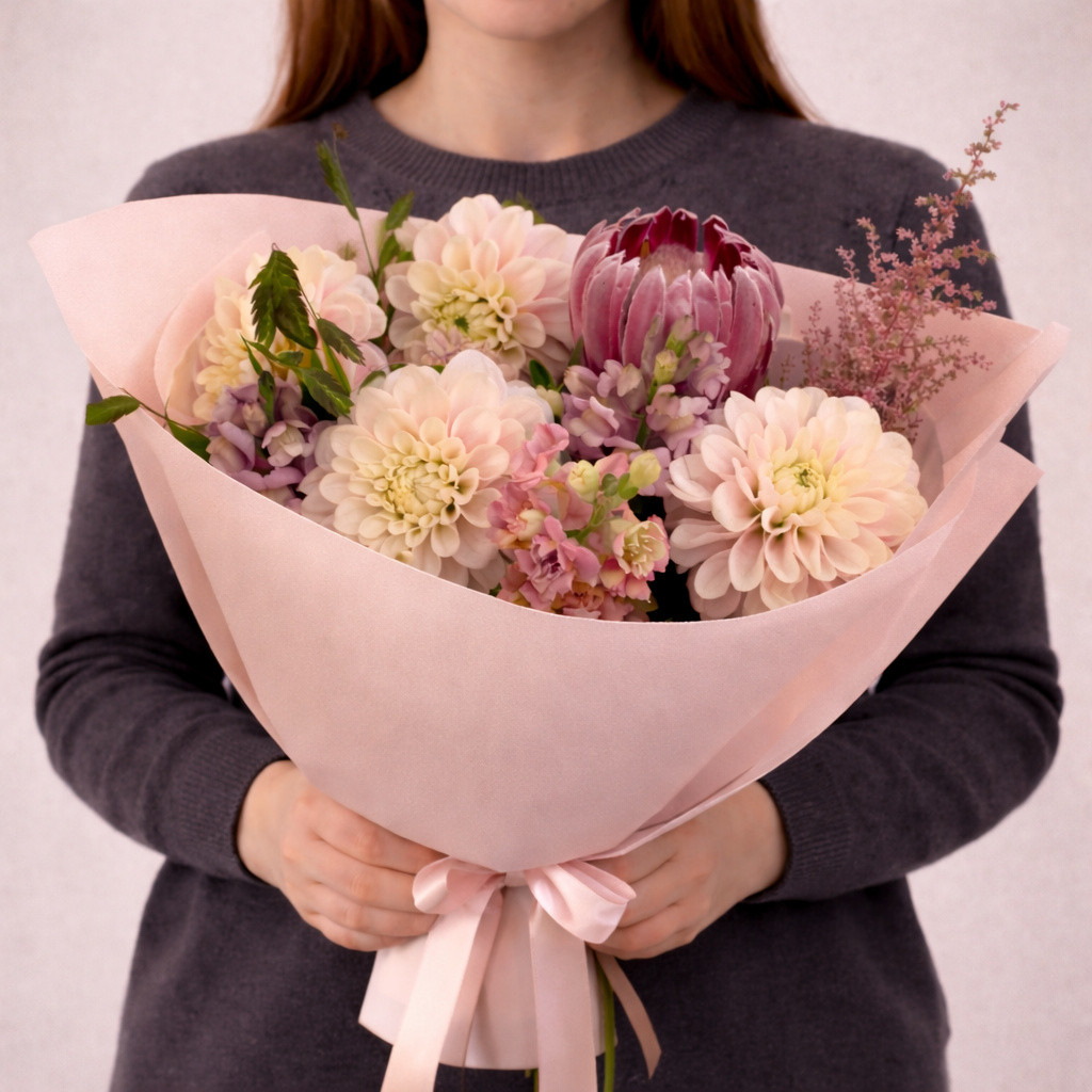 | Состав: | Георгины, Маттиола, Розы |