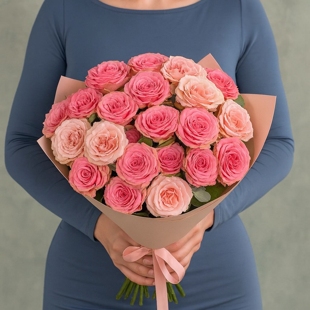 Трендовый микс пионовидных кустовых роз в пудрово-розовых оттенках — эффектный, нежный и очень «инстаграмный» букет. Идеален для поздравления с днём рождения, признания в чувствах и как универсальный подарок «просто так». Аккуратная матовая упаковка подчёркивает фактуру лепестков, а букет выглядит безупречно на фото и в жизни — готов к быстрой доставке.