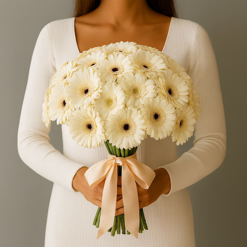 Изысканный букет из нежных кремовых гербер, собранных в пышную округлую композицию. Лёгкость оттенков и воздушность создают утончённый образ, идеально подходящий для особого случая или признания в чувствах.