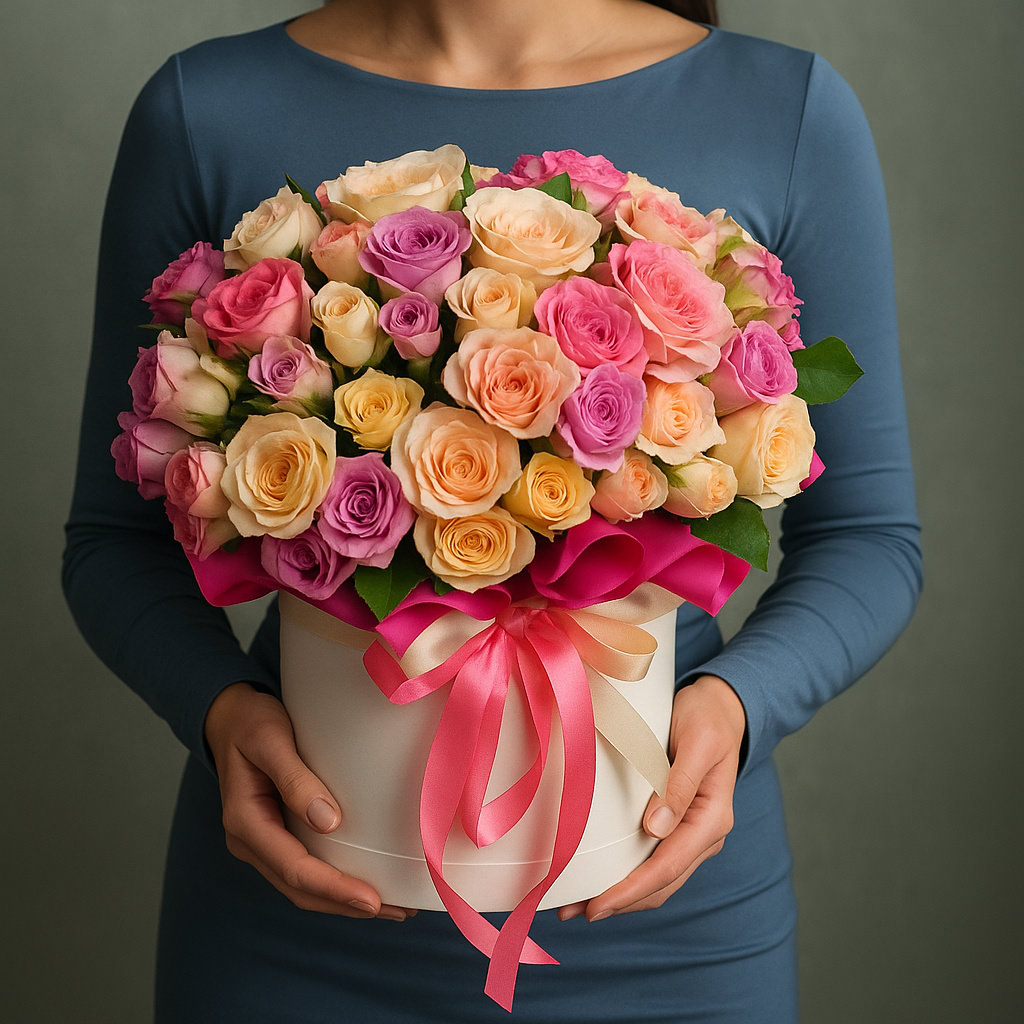 Роскошная композиция из роз в белой коробке — символ нежности и утончённости. Отличный выбор для признания в чувствах или праздничного подарка.