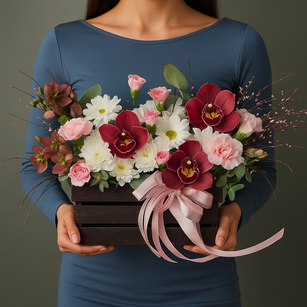 Яркая и стильная композиция с орхидеями и розами в деревянном ящике. Для тех, кто любит необычные решения и ценит красоту в деталях.