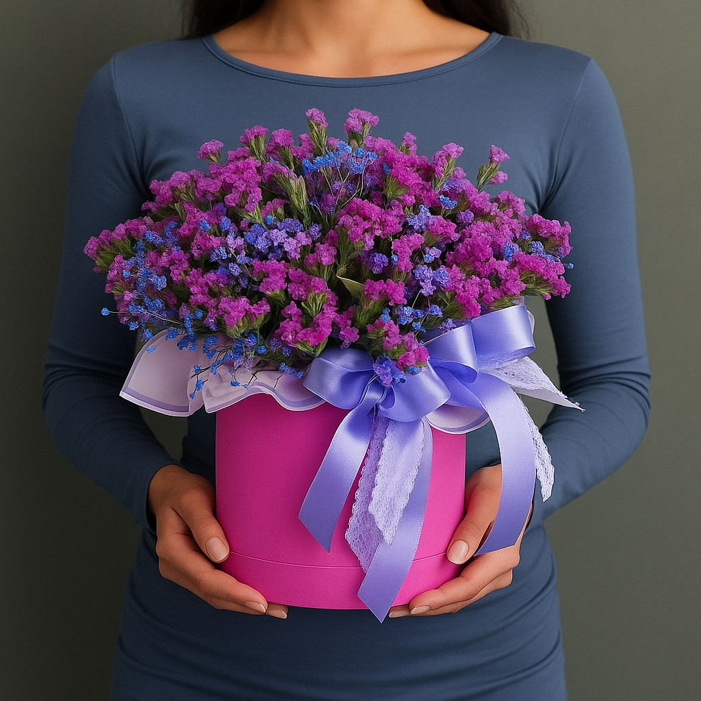 Воздушная композиция из статицы в насыщенно-фиолетовых тонах станет оригинальным подарком и настоящим украшением интерьера.