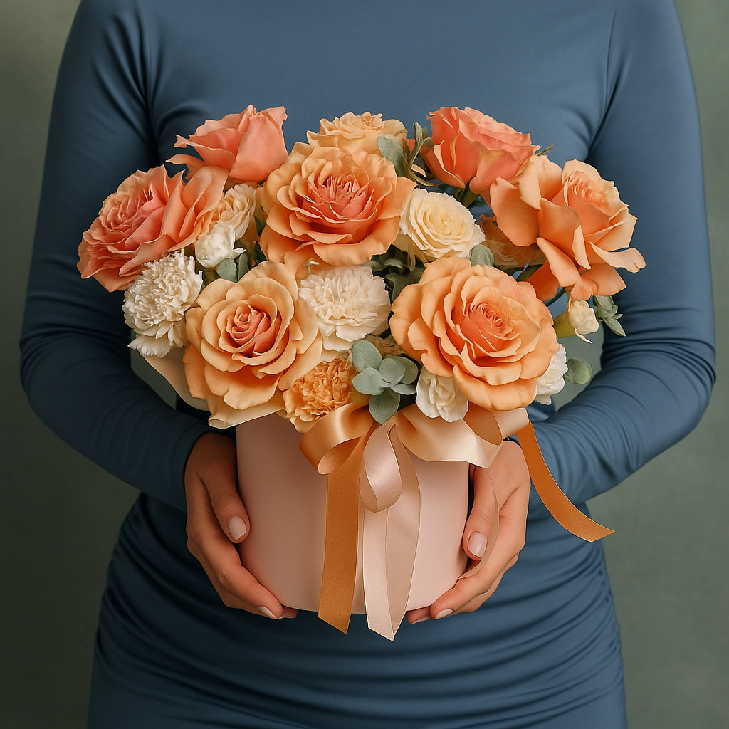 Роскошные розы и гвоздики в тёплых персиковых тонах подарят атмосферу нежности и уюта. Идеально для поздравлений и романтических случаев.